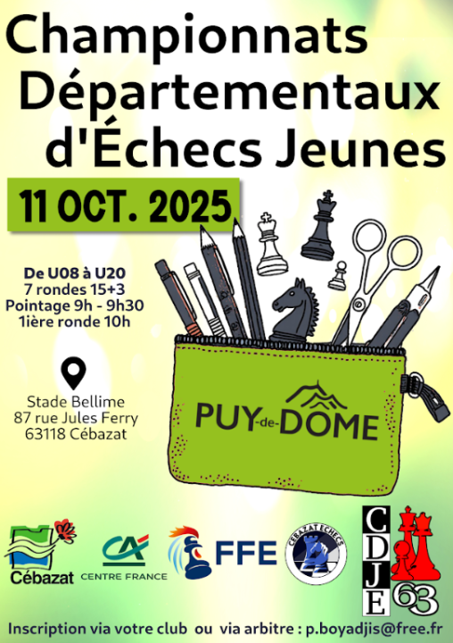 Cébazat Échecs organise le Championnat Départemental Jeunes ce Samedi 11 Octobre !